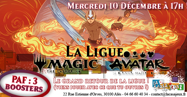 La ligue Magic est de retour ! Le concept est toujours le même : vous prenez 3 boosters (de préférence Avatar, mais pas obligé) pour faire un deck de 30 cartes. Ce deck peut ensuite être amélioré avec un nouveau booster par semaine, et un de plus au bout de 3 défaites. Vous pouvez rejoindre la ligue quand vous le