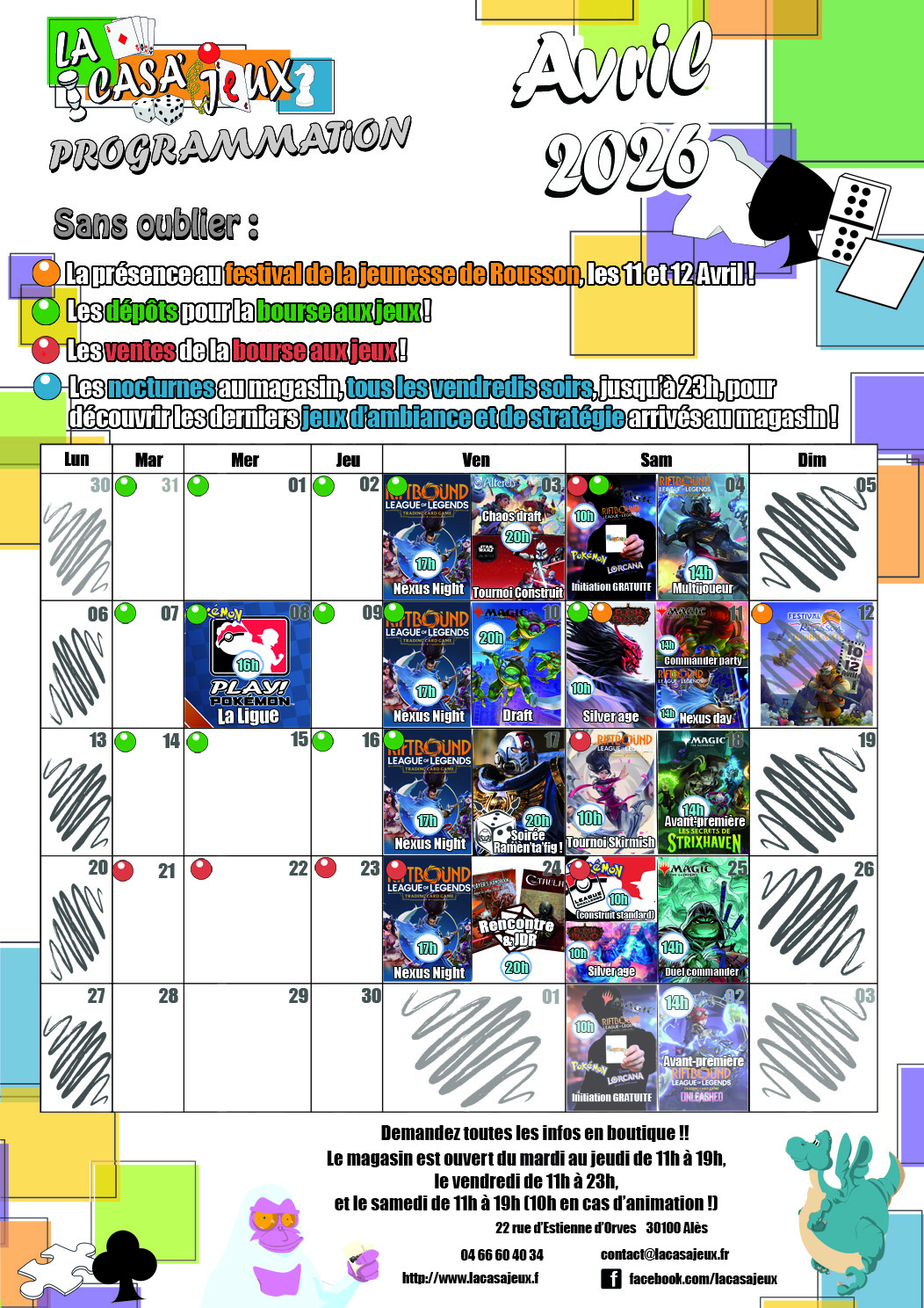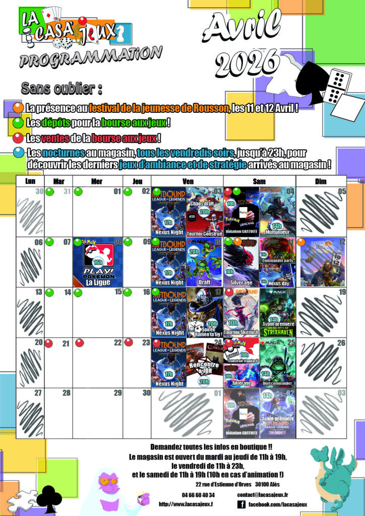 Le programme des animations d’Avril est en ligne ! 30 mars 2026 Talggir Le programme des animations d’Avril est en ligne ! Venez en parler, le partager, et participer 😉 Marqué avec Altered, Figurines, jeu de rôle, League of Legends, Magic, MTG, Pokémon, Riftbound, strixhaven, SWU Les événements